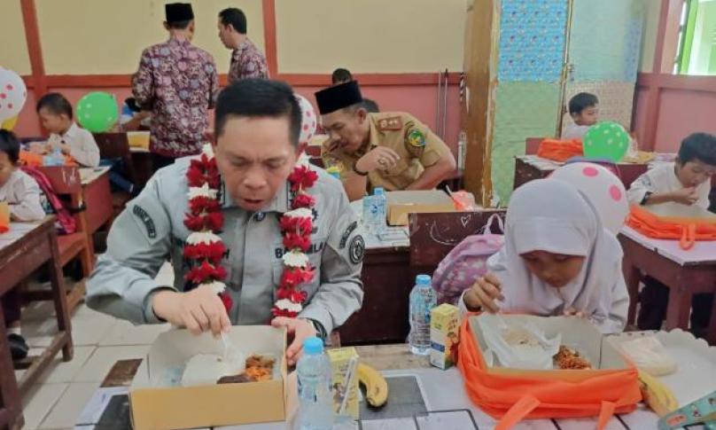Selanjutnya, dalam rangka HUT ke-19 BAKAMLA-RI, Irvansyah mengajak siswa-siswi di SD 4 makan siang bergizi.