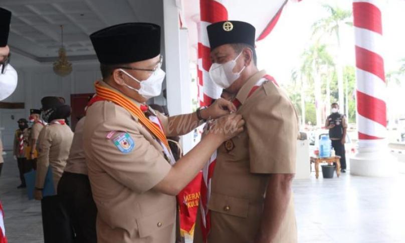 BENGKULU,eWARTA.co -- Gubernur Bengkulu, Rohidin Mesyah memberikan anugerah Gerakan Pramuka Lencana Pancawarsa untuk dua tokoh pendidikan di Universitas Islam Negeri Fatmawati Sukarno. Penghargaan diberikan pada pada kegiatan Apel Besar Hari Pramuka ke-60 Kwartir Daerah 07 Bengkulu di Balai Raya Semarak, Minggu (15/08/2021).