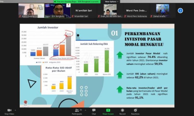 Bayu memaparkan bahwa pertumbuhan pasar modal di Indonesia hingga Agustus 2021 cukup tinggi mencapai 6.100.525 investor. Dan itu juga terjadi di Provinsi Bengkulu yang tumbuh secara masif dan terus mengalami peningkatan.