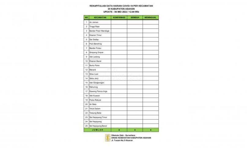 Dimana data sebelumnya pada tanggal 05 Mei 2022 Rekapitulasi Harian Covid – 19 per Kecamatan di Asahan masih nihil, tidak ada orang yang Terkonfirmasi Positif, tidak ada orang yang sembuh dan tidak ada orang yang meninggal dunia akibat Covid – 19.