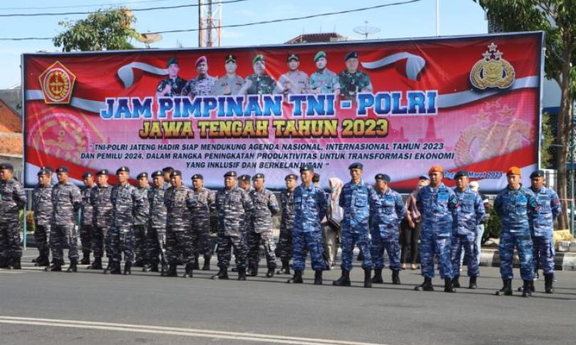 TEGAL, eWARTA.co - Jajaran TNI-Polri di Kota dan Kabupaten Tegal melaksanakan apel bersama untuk memantapkan sinergitas aparat keamanan menjelang tahapan Pemilu 2024, bertempat di jalan Pancasila Kawasan Alun-alun Kota Tegal, Selasa (7/3/2023).
