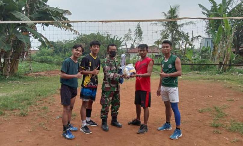 Batiter Kodim Depok, Peltu Joki secara simbolis menyerahkan bantuan alat olaharaga berupa bola dan net voli kepada ketua tim voli putra, Darwin disaksikan Suria Eto selaku Ketua RT 03/05, Kelurahan Pengasinan.