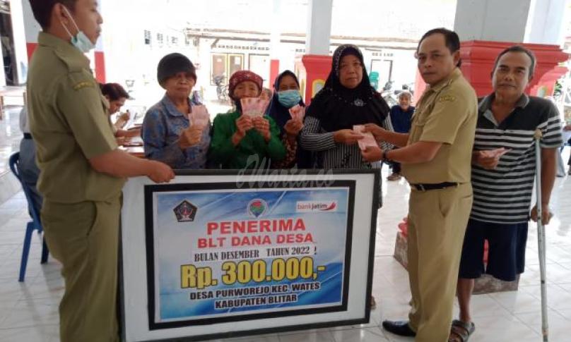 Kepala Desa Purworejo Jarno menjelaskan bahwa bantuan langsung tunai (BLT) yang dibagikan kepada 1OO KPM pada tahap 12 bulan Desember tahun 2022 ini, dengan nilai bantuan sebesar Rp 300.000 setiap bulannya anggaran Dana Desa tahun 2022.