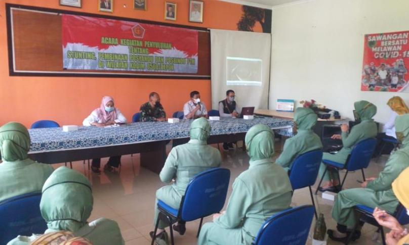 DEPOK,eWARTA.co -- Satgas TNI Manunggal Membangun Desa (TMMD) Ke-112 tahun 2021 Kodim 0508/Depok gencar melakukan penyuluhan Stunting dalam kegiatan non fisik di berbagai kelurahan di Kota Depok. Seperti penyuluhan yang dilakukan di kelurahan Sawangan, Kecamatan Sawangan yanh diikuti oleh anggota Persit, kader PKK, Posyandu dan Posbindu.
