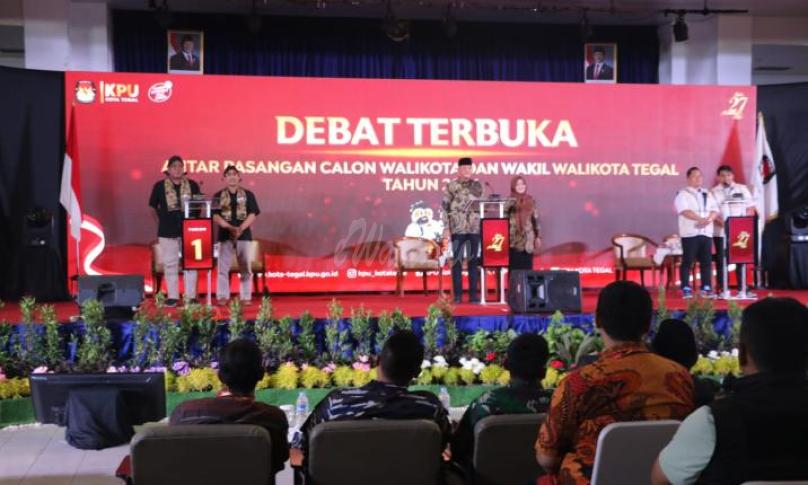 KOTA TEGAL, eWarta.co -- Komisi Pemilihan Umum (KPU) Kota Tegal menggelar Debat Terbuka Perdana antar pasangan calon (paslon) Wali Kota dan Wakil Wali Kota Tegal tahun 2024 yang berlangsung di Gedung Pertemuan Hotel Bahari Inn, Rabu (23/10/2024) malam.