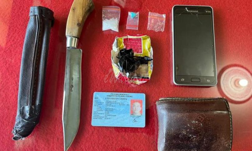 Pada penangkapan tersebut polisi juga menemukan senjata tajam berupa satu bilah pisah yang melekat pada badan pelaku.