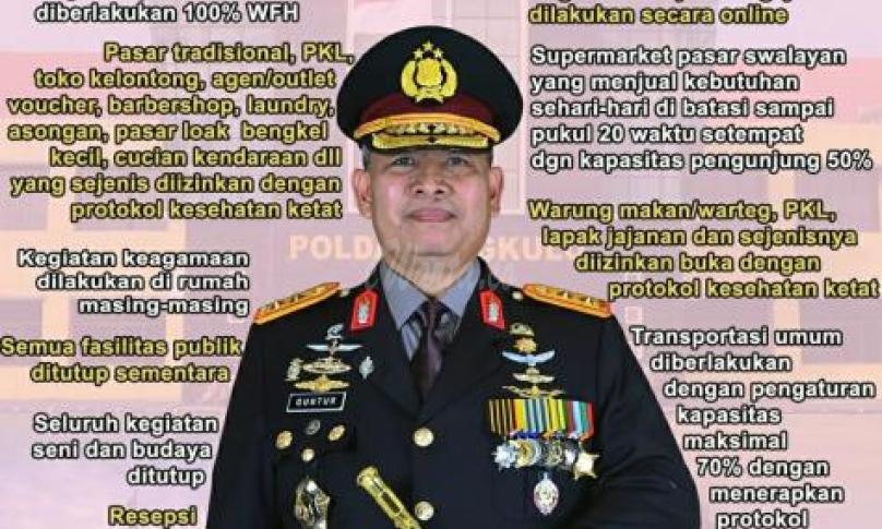 BENGKULU,eWARTA.co -- Kota Bengkulu berdasarkan merupakan salah satu kota yang memberlakukan (PPKM) Level 4 untuk wilayah Luar Jawa. Kabid Humas Polda Bengkulu Kombespol. Sudarno, S.Sos, MH mengatakan aturan tersebut berlaku mulai 26 Juli 2021 hingga 2 Agustus 2021 tertuang dalam Instruksi Menteri Dalam Negeri (Inmendagri) Nomor 25 Tahun 2021 tentang PPKM Level 4 Covid-19 di Wilayah Sumatera, Kalimantan, Sulawesi, Nusa Tenggara, Maluku dan Papua.