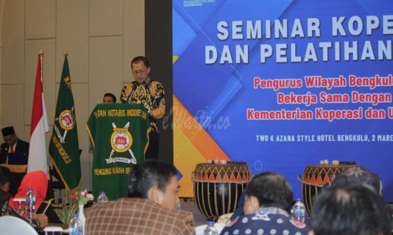 BENGKULU, eWarta.co -- Kepala Kantor Wilayah Kemenkumham Bengkulu (Santosa) membuka secara resmi kegiatan Seminar dan Pelatihan Notaris Pembuat Akta Koperasi (NPAK) yang dilaksanakan oleh Pengurus Wilayah Ikatan Notaris Indonesia (INI) Bengkulu bersama Dinas Koperasi dan Usaha Mikro Kecil Menengah (UMKM) di Two K Azana Style Hotel Bengkulu (02/03/2024).