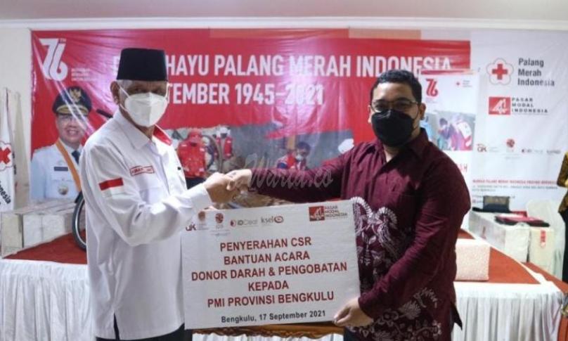 BENGKULU,eWARTA.co -- Peringatan hari ulang tahun (HUT) Palang Merah Indonesia (PMI) Nasional ke-76, organisasi regulator mandiri (SRO) pasar modal Indonesia yang terdiri atas PT Bursa Efek Indonesia (BEI), PT Kliring Penjaminan Efek Indonesia (KPEI), dan PT Kustodian Sentral Efek Indonesia (KSEI), mengalokasikan seluruh pendapatan dari transaksi pasar modal untuk membantu kegiatan donor plasma dan donor darah di Provinsi Bengkulu.