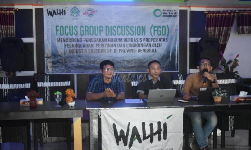 BENGKULU, eWarta.co -- WALHI Bengkulu mendorong penegakan hukum terhadap tiga perusahaan melalui pengaduan resmi ke Kementerian Lingkungan Hidup dan Kehutanan (KLHK) serta APH atas dugaan pelanggaran dan ketidakpatuhan perizinan. Ketiga perusahaan tersebut adalah PT Injatama dan PT Sandabi Indah Lestari (PT SIL) di Kabupaten Bengkulu Utara serta PT Bara Mega Quantum (PT BMQ) di Kabupaten Bengkulu Tengah.