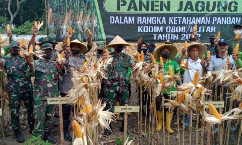 Blitar, eWarta.co -- Tingkatkan ketahanan pangan, Kodim 0808 Blitar menggelar panen raya jagung di lahan perhutani petak 59 kelurahan Kedung Bunder kecamatan Sutojayan kabupaten Blitar, dihadiri 50 orang peserta. Sabtu (5/11/2022).