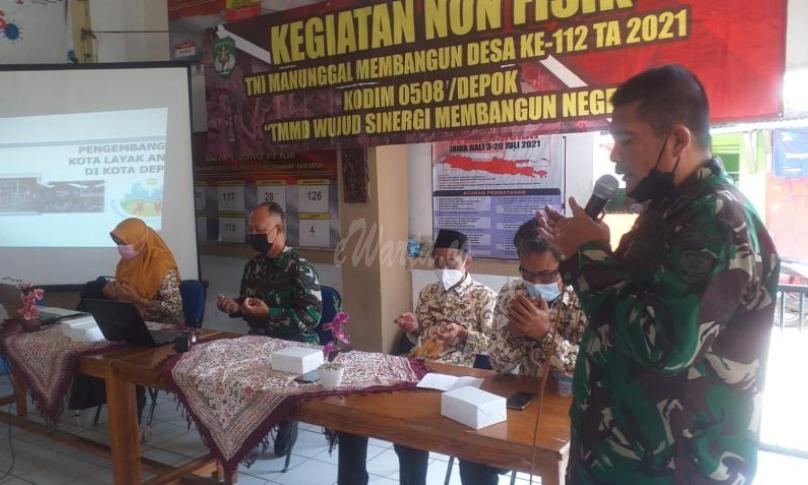 DEPOK,eWARTA.co -- Satgas TMMD Ke-112 tahun 2021 bersama Dinas Perlindungan Anak Pemberdayaan Masyarakat dan Keluarga (DPAPMK) Kota Depok menyelenggarakan sosialisasi tentang Kota Ramah Anak di aula Kelurahan Pasir Putih, Kecamatan Sawangan, Depok, pada Kamis (07/10/21) .