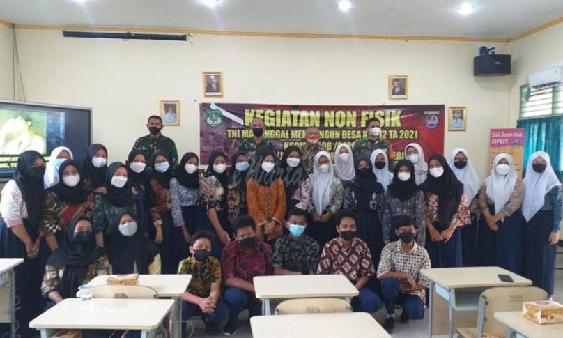 DEPOK,eWARTA.co -- Satgas TNI Manunggal Membangun Desa (TMMD) Ke-112 tahun 2021 Kodim 0508/Depok bersama Dinas Kesehatan Kota Depok menggelar Sosialisasi 5 Pilar Sanitasi Total Berbasis Masyarakat (STBM) kepada siswa SMP Negeri 5 Depok, Kelurahan Bedahan Kecamatan Sawangan, Jumat (01/10/21)