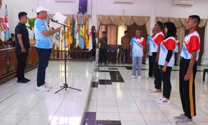 TEGAL, eWarta.co -- Wali Kota Tegal, H. Dedy Yon Supriyono mengkukuhkan 113 atlet Kontingen Kota Tegal di Pekan Olahraga Provinsi (Porprov) XII Jawa Tengah Tahun 2023 di Ruang Adipura Balaikota Tegal, Minggu (19/3/2023). Wali Kota Tegal berharap para atlet agar berlatih secara rutin dan diimbangi dengan atitude yang baik.