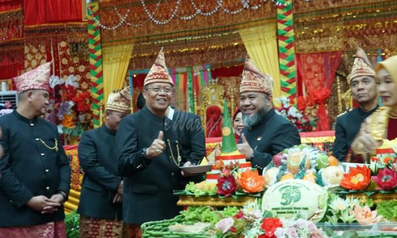 BENGKULU, eWarta.co -- Rapat Paripurna dalam rangka Hari Ulang Tahun (HUT) ke-57 Provinsi Bengkulu digelar di Gedung DPRD Provinsi Bengkulu, Selasa (18/11) pagi. Gubernur Bengkulu Helmi Hasan hadir mengenakan pakaian adat Bengkulu bersama istrinya, Khairunnisa. Keduanya tiba di kantor DPRD dengan menggunakan delman, didampingi Wakil Gubernur Mian beserta istri, Eko Kurnia Ningsih.