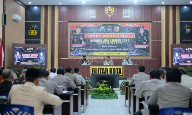 Blitar, eWarta.co - Polres Blitar Kota menggelar rapat koordinasi (rakor) lintas sektoral dalam rangka persiapan Operasi Lilin Semeru 2022 di Gedung Patriatama Mapolres Blitar Kota, Kamis (15/12/2022).