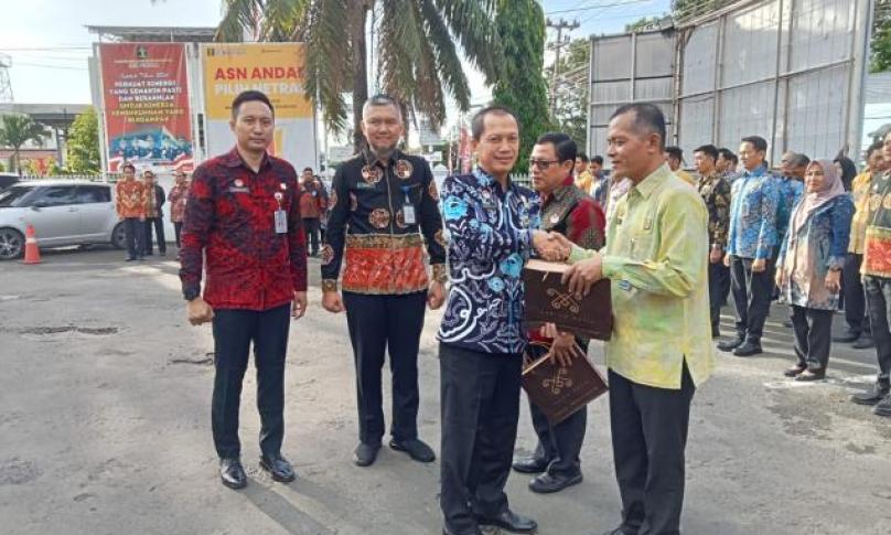 Apresiasi Dan Penghargaan Disampaikan Kepala Kantor Wilayah Kementerian Hukum Dan HAM Bengkulu, (Santosa) Kepada (M. Darwin), Kepala Sub Bidang Pengelolaan Basan, Baran Dan Keamanan, Dan (Tosimun) Kepala Sub Bidang Pelayanan Kekayaan Intelektual Atas Dedikasi Dan Pengabdiannya.
