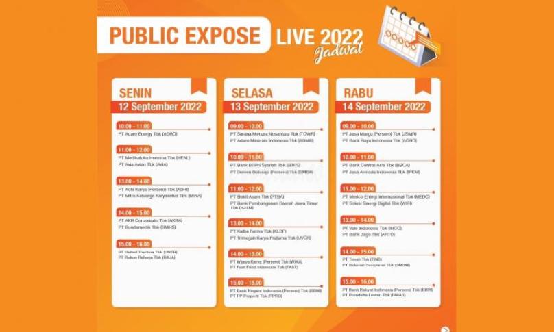 Jakarta, eWarta.co – PT Bursa Efek Indonesia (BEI) bersama PT Kliring Penjaminan Efek Indonesia (KPEI) dan PT Kustodian Sentral Efek Indonesia (KSEI) serta didukung oleh Otoritas Jasa Keuangan (OJK), kembali menyelenggarakan acara Public Expose LIVE. Acara ini merupakan rangkaian dari peringatan 45 Tahun Diaktifkannya Kembali Pasar Modal Indonesia. Public Expose LIVE 2022 diadakan secara virtual selama 5 hari, yaitu dari tanggal 12 sampai dengan 16 September 2022. Sebanyak 54 perusahaan tercatat berpartisipasi menyampaikan pemaparan kinerja dan rencana kepada publik.