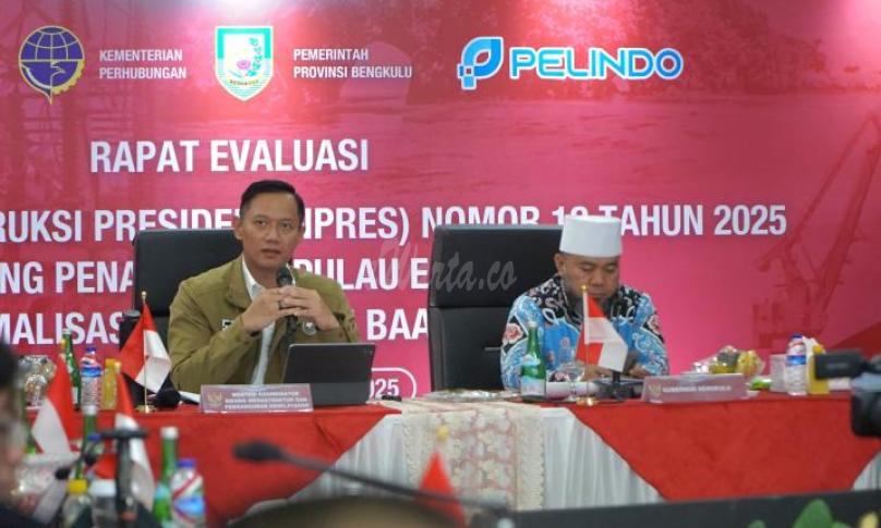 BENGKULU, eWarta.co -- Usai meninjau alur Pelabuhan Pulau Baai Bengkulu, Menteri Koordinator Bidang Infrastruktur dan Pembangunan Kewilayahan RI, Agus Harimurti Yudhoyono (AHY), memimpin Rapat Evaluasi Pelaksanaan Instruksi Presiden (Inpres) Nomor 12 Tahun 2025 tentang Penanganan Pulau Enggano dan Normalisasi Alur Pulau Baai. Rapat tersebut digelar di Balai Raya Semarak Bengkulu, Selasa (16/9/2025).