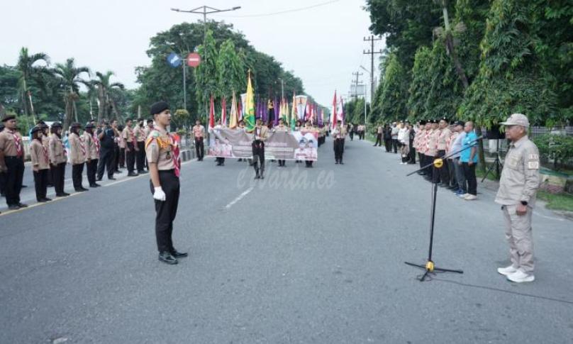ASAHAN, eWARTA.co -- Ketua Majelis Pembimbing Cabang (Mabicab) Gerakan Pramuka Asahan H. Surya, BSc didampimgi oleh Sekretaris Daerah Kabupaten Asahan (Ketua Harian Mabicab Gerakan Pramuka Asahan), Kepala BNN Kabupaten Asahan, OPD (Anggota Mabicab Gerakan Pramuka Asahan) dan Camat (Ketua Majelis Pembimbing Ranting) melepas Kirab Tangkal Napza Kwartil Daerah Gerakan Pramuka Sumatera Utara (Sumut) Tahun 2022 dari Kabupaten Asahan di Jalan Lintas Sumatera depan Rumah Dinas Bupati Asahan, Minggu (18/09/2022).