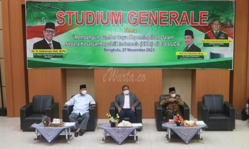 BENGKULU,eWARTA.co -- Stadium Generale dengan Tema ” Membangun sumber daya kepemimpinan dalam Negara kesatuan Republik Indonesia di Era VUCA” yang digelar di Aula Pasca Sarjana UINFAS Bengkulu dengan menghadirkan langsung Danrem 041/Gamas Bengkulu Brigjen TNI Dr. Achmad Budi Handoyo, M.Tr (han), Sabtu (27/11/2021)