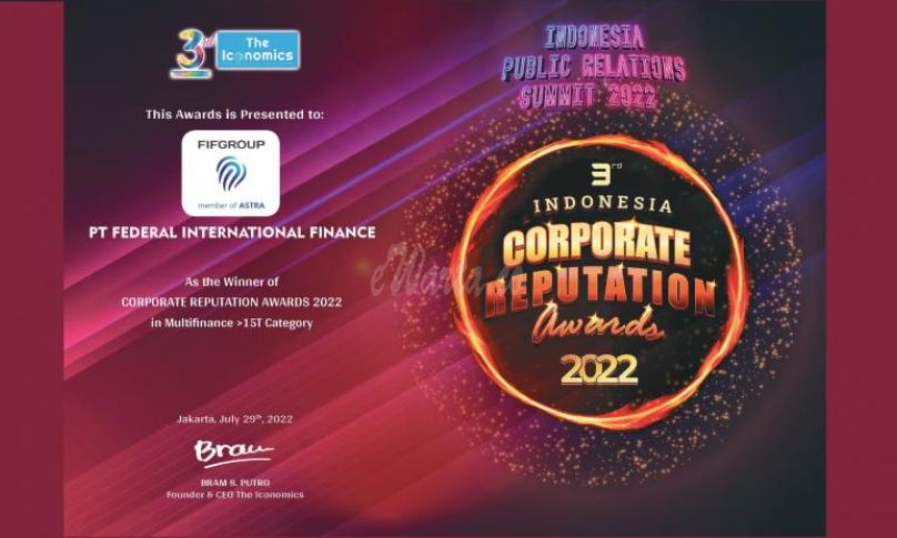 Dalam kesempatan yang berbahagia tersebut, FIFGROUP menerima penghargaan Corporate Reputation Awards 2022 kategori Pembiayaan Di Atas Rp 15 Triliun. Penghargaan itu diterima oleh Corporate Communication and Corporate Social Responsibility (CSR) Deputy Division Head FIFGROUP, Robertus Benny Dwi Koestanto secara virtual.
