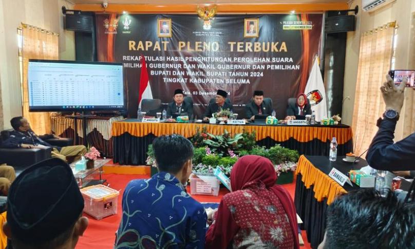 SELUMA, eWarta.co -- Komisi Pemilihan Umum (KPU) Kabupaten Seluma laksanakan rapat rekapitulasi hasil penghitungan perolehan suara pilkada gubernur dan wakil gubernur Bengkulu serta bupati dan wakil bupati Seluma tahun 2024, rapat pleno ditingkat Kabupaten tersebut dilaksanakan di Aula sekretariat KPU Seluma.
