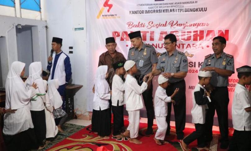 BENGKULU, eWarta.co -- Dalam rangka memperingati Hari Bakti Imigrasi Ke-74, Kanwil Kemenkumham Bengkulu dan Kanim Kelas I TPI Bengkulu menggelar bakti sosial dan memberikan santunan di Panti Asuhan Bumi Nusantara, Senin (22/01/2024). Turut hadir Kepala Divisi Keimigrasian (Ramdhani), Kepala Divisi Pemasyarakatan (Teguh Wibowo), Kepala Kantor Imigrasi Kelas I TPI Bengkulu (Acan Hi Tulis), pejabat struktural Kanim Kelas I TPI Bengkulu dan Divisi Keimigrasian beserta staff.