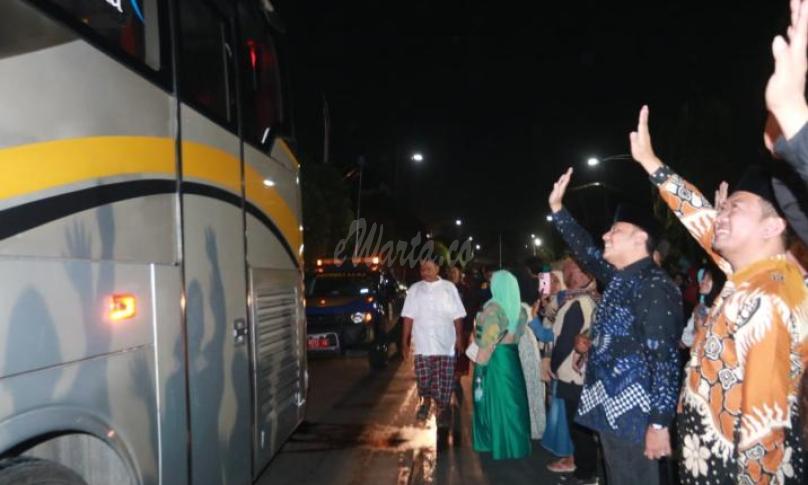 TEGAL, eWarta.co - Wali Kota Tegal, H. Dedy Yon Supriyono yang didampingi Forkopimda Kota Tegal, Pj. Sekretaris Daerah Kota Tegal, Agus Dwi Sulistyantono dan jajaran Kantor Kementerian Agama Kota Tegal memberangkatkan secara resmi 202 jamaah calon haji Kota Tegal di Halaman Depan Kantor BKPPD Kota Tegal, Jl. Ki Gede Sebayu Kota Tegal ke Asrama Haji Donohudan, Sabtu (3/6/2023) pukul 02.00 dini hari.