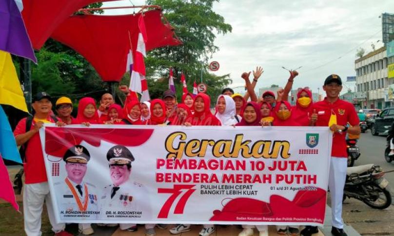 Bengkulu, eWarta.co -- Pemerintah Provinsi Bengkulu melalui Badan Kesatuan Bangsa dan Politik (Kesbangpol) melaksanakan Gerakan Pembagian 10 juta Bendera Merah Putih untuk menyemarakkan peringatan Hari Ulang Tahun (HUT) Ke-77 RI.