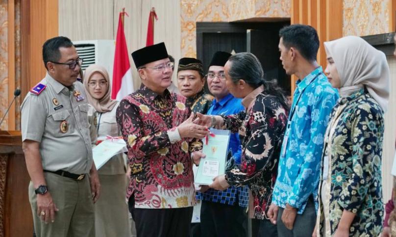 BENGKULU, ewarta.co -- Gubernur Rohidin Mersyah menyerahkan 200 Sertipikat Tanah Kegiatan PTSL Tahun Anggaran 2023 di Lingkungan Kanwil BPN Prov Bengkulu di ruang Pola Pemda Provinsi Bengkulu, Senin (4/11).