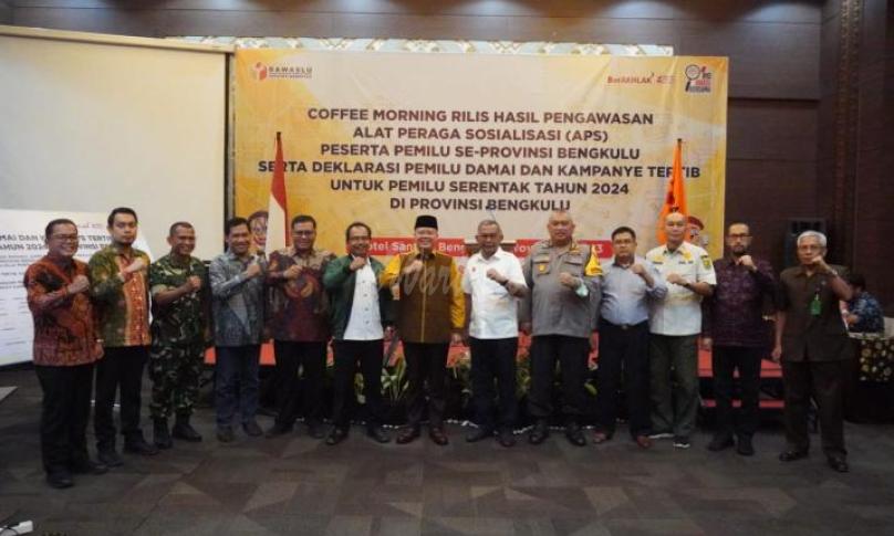 BENGKULU, ewarta.co -- Gubernur Bengkulu Rohidin Mersyah menghadiri Coffee Morning terkait Rilis Hasil Pengawasan Alat Peraga Sosialisasi (APS) Peserta Pemilu se-Provinsi Bengkulu serta Deklarasi Pemilu Damai dan Kampanye Tertib untuk Pemilu Serentak Tahun 2024, di ballroom salah satu hotel di kawasan Sawah Lebar Kota Bengkulu, Kamis (02/11/2023).