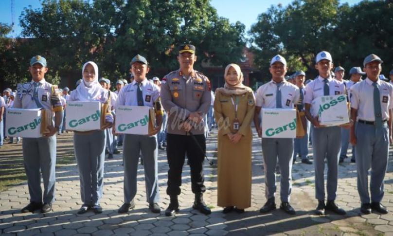 Sebagai bentuk kepedulian, dalam kesempatan ini Kapolres secara simbolis memberikan bingkisan kepada sejumlah perwakilan pelajar di SMK Negeri 3 Kota Tegal, berupa Helm, kaos dan uang pembinaan.