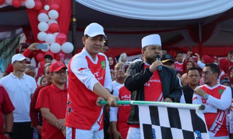 BENGKULU, eWARTA.co -- Kapolresta Kombes Pol Arif Sulistyono mendampingi Walikota Bengkulu Helmi Hasan dalam melepas Jalan Santai Merah Putih di kawasan Berendo Masjid Agung At Taqwa Jalan Soekarno Hatta Kelurahan Anggut Atas Kecamatan Ratu Samban Kota Bengkulu, Jumat (10/03/23) pagi.