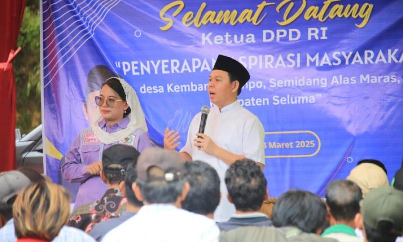 BENGKULU, eWarta.co -- Ketua Dewan Perwakilan Daerah (DPD) RI, Sultan Bakhtiar Najamudin memuji keaktifan Senator Apt Destita Khairilisani S.Farm., MSM., di lembaga DPD RI. Hal itu Ia utarakan saat menyerap aspirasi masyarakat Desa Kembang Mumpo, Kecamatan Semidang Alas Maras, Kabupaten Seluma, pada Minggu (23/3).