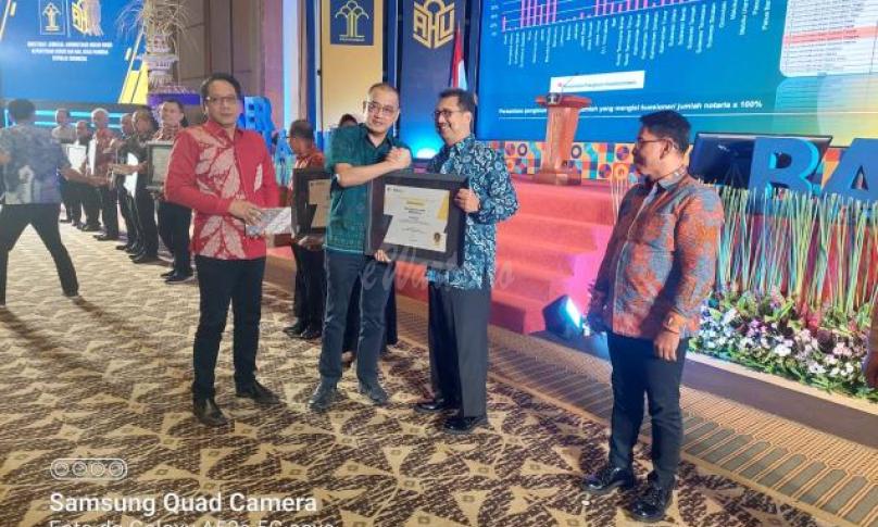 Penghargaan diterima langsung oleh Kepala Divisi Pelayanan Hukum dan HAM *Andrieansjah* yang didampingi oleh Kepala Bidang Pelayanan Hukum Suriyanti dan Staf Subbidang Pelayanan AHU.