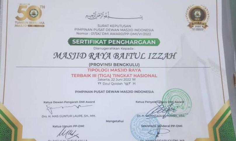 Bengkulu, eWARTA.co -- Untuk pertamakalinya Masjid Raya Baitul Izzah Provinsi Bengkulu berhasil meraih predikat juara III tingkat Nasional kategori Masjid Raya se-Indonesia dalam ajang Dewan Masjid Indonesia (DMI) Award Masjid-masjid terbaik se-Indonesia tahun 2022.