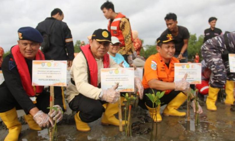 BENGKULU, eWARTA.co -- Wujud tanggung jawab dalam menjaga alam Bengkulu, Basarnas Bengkulu, Pemerintah Provinsi Bengkulu, TNI/Polri, Lestari Alam Laut Untuk Negeri (LATUN) Bengkulu serta Instansi lainnya dan para komunitas pemerhati lingkungan, melakukan penanaman pohon mangrove pesisir pantai Bengkulu, yaitu di sekitar kawasan Jenggalu Kito Kota Bengkulu, Senin (27/2).