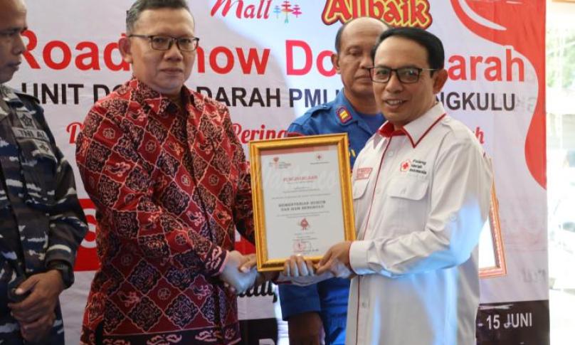 Pada kesempatan ini, Kanwil Kemenkumham Bengkulu menerima piagam penghargaan atas dukungan dan kerjasama yang telah diberikan pada kegiatan donor darah yang diselenggarakan oleh PMI Kota Bengkulu.