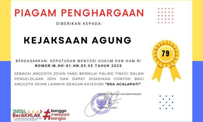 Piagam penghargaan diberikan kepada Kejaksaan Agung RI karena keberhasilannya dalam pengelolaan informasi hukum di situs web Kejaksaan RI. Prestasi ini menjadikan koleksi peraturan perundang-undangan mudah diakses, cepat, dan selalu terupdate, memberikan manfaat signifikan bagi media dan masyarakat.