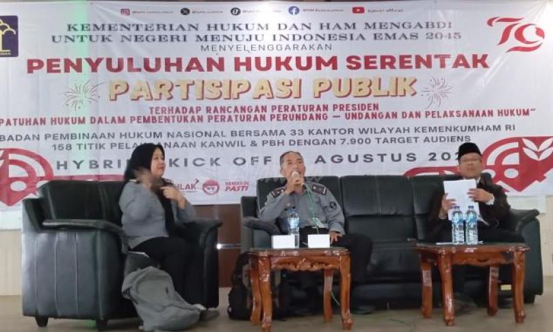 BENGKULU, eWarta.co – Kantor Wilayah Kementerian Hukum dan Hak Asasi Manusia Bengkulu melaksanakan penyuluhan hukum serentak dengan tema "Partisipasi Publik Terhadap Rancangan Peraturan Presiden." Kegiatan ini merupakan bagian dari acara nasional yang digelar oleh Badan Pembinaan Hukum Nasional (BPHN) bekerja sama dengan 33 Kantor Wilayah Kemenkumham di seluruh Indonesia, mencakup 158 titik pelaksanaan dengan target mencapai 7.900 audiens, Selasa (13/8/2024).