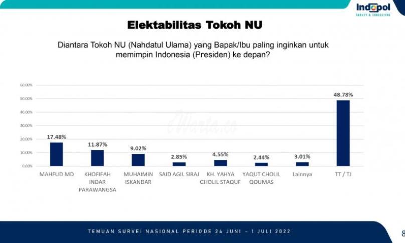 “17,48 persen warga NU memilih Mahfud MD ketika ditanya di antara tokoh NU yang bapak atau ibu paling inginkan untuk memimpin Indonesia (Presiden) ke depan, kemudian 11,87% memilih Khofifah Indar Parawangsa,” kata Retno dalam rilis surveinya, Senin (18/7).