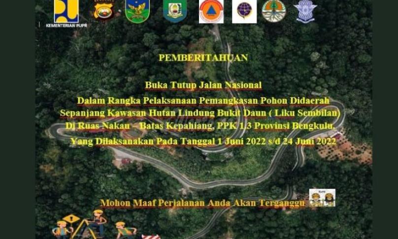 Bengkulu, eWARTA.co - Pemerintah Provinsi Bengkulu bersama Badan Pelaksanaan Jalan (BPJN) Bengkulu akan memberlakukan buka tutup jalan lintas nasional di Kabupaten Bengkulu Tengah-Kepahiang atau sepanjang kawasan hutan lindung Bukit Daun (Liku Sembilan) pada tanggal 1 Juni hingga 24 Juni 2022 menyusul akan dilaksanakannya pemangkasan pohon di daerah tersebut.