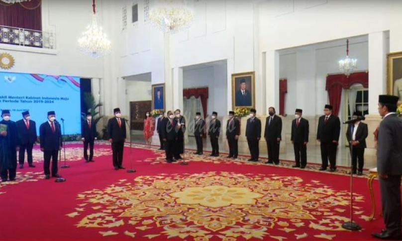 Usai pembacaan Keppres tersebut Presiden Joko Widodo kemudian memimpin pengucapan sumpah jabatan para menteri dan wamen Kabinet Indonesia Maju sisa masa jabatan periode tahun 2019-2024 tersebut.