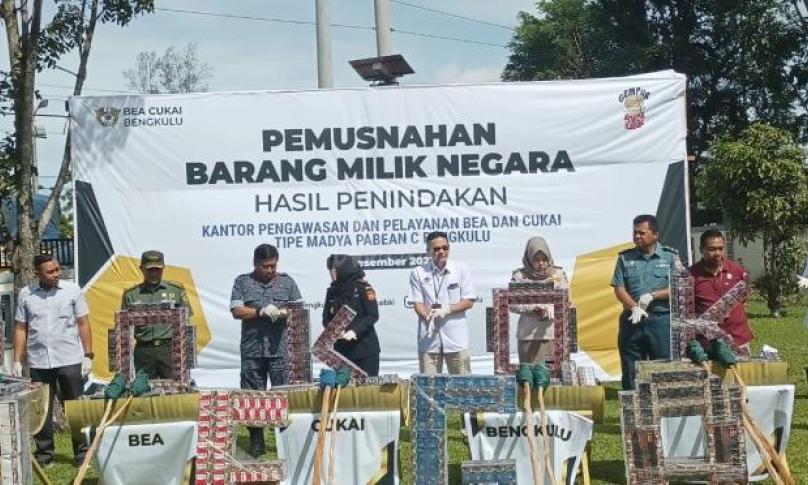 Bengkulu, eWarta.co -- Jajaran Kantor Pengawasan dan Pelayanan Bea dan Cukai Bengkulu melakukan pemusnahan Barang Milik Negara (BMN) hasil penindakan tahun 2022, di Halaman Kantor Bea dan Cukai Bengkulu, Kamis (8/12/2020).