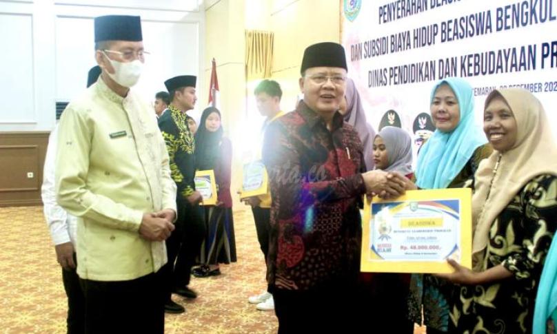 BENGKULU, eWarta.co -- Gubernur Rohidin Mersyah membagikan beasiswa kepada mahasiswa berprestasi yang berasal dari 9 Kabupaten dan Kota Bengkulu, Jumat (22/12/2023)